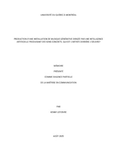 Ce mémoire en recherche-création vise à interroger la notion de paternité de l’oeuvre à l’ère de l’intelligence artificielle (IA), à travers la création d’une installation de musique générative. L’objectif est de comprendre qui doit être considéré comme l’auteur d’une oeuvre produite en partie ou en totalité par une IA. Le projet s’étend sur plusieurs années et propose la création d’un instrument, un glockenspiel modifié, contrôlé par une IA musicale (Magenta). L’oeuvre est entièrement automatisée, sans intervention humaine lors de l’exécution sonore. Les sujets traités sont multiples : créativité, art génératif, dispositifs techniques, reconnaissance artistique, et les implications juridiques, sociales et éthiques liées à la création avec IA. Le mémoire formule plusieurs questions de recherche, notamment : Peut-on encore parler de création artistique lorsque l’oeuvre est générée par une machine? et Quel statut juridique et artistique peut-on attribuer à une IA dans le processus créatif? La méthodologie comprend une analyse théorique d’oeuvres existantes, une exploration des cadres légaux et une documentation du processus de création artistique ainsi que des divers prototypes. Le mémoire fait des références conceptuelles aux théories de Howard S. Becker, Jean Dubuffet, André Malraux, Mihaly Csikszentmihalyi, Robert Sternberg. Todd I. Lubart, Simon Schaffer et Mario Klingemann ainsi qu’aux oeuvres de Lauren McCarthy, Taryn Southern et Kyle McDonald. Parmi les résultats, on observe que l’IA peut prendre plusieurs formes dans la création et quelle peut à la fois être un outil et un partenaire créatif. Cependant, la reconnaissance légale ou artistique de son rôle reste ambiguë. La réflexion propose une approche collaborative entre artiste et IA, sans occulter les enjeux de droits d’auteur. La conclusion de ce mémoire souligne l’urgence d’un cadre éthique et juridique adapté, tout en affirmant que la valeur artistique repose toujours sur l’intention et la vision humaine.