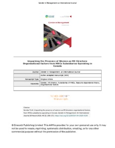 Turki, Sondes (2025). « Unpacking the Presence of Women as HR Directors: Organisational factors from MNCs Subsidiaries Operating in Canada ». Gender in Management: an International Journal, 40(2), pp. 256-271.