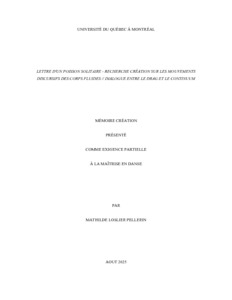 Lettre d’un poisson solitaire est une recherche création qui interroge les mouvements discursifs des corps fluides par la mise en dialogue de la pratique performative du Drag et de la pratique somatique du Continuum. Elle propose une réflexion par l’art vivant sur ce que peut être un corps fluide et ses potentielles réverbérations politiques. Le dialogue entre le Drag et le Continuum est étudié dans une perspective queer et est réfléchi à partir des épistémologies post-humanistes féministes. Cette recherche s’inscrit dans une démarche personnelle où j’ai été accompagné, informé et inspiré par l’élément eau qui traverse mon corps et circule mon quotidien. Cette recherche éclaire les paradoxes, les détours et les rythmes nécessaires au développement d’une démarche hydrologique de création. Les phénomènes de dissolution, de stratification, de sédimentation, de résistance, de transgression et de gestation du chaos y sont dépliés à travers un récit de pratique. Ce récit illustre des processus de transformation personnels, artistiques, conceptuels et politiques. Ce projet repense l’entrelacement des conceptions matérielles, conceptuelles et expérientielles des corps fluides comme une modalité de micro-activisme. Ce processus créatif réfléchit à comment la mise en dialogue de deux pratiques de corps fluides aux épistémologies éloignées peut informer les contextes politiques, écologiques et relationnels en constante fluctuation et peut alimenter des démarches nécessaires pour rendre aux corps leurs aptitudes d’adaptation. Les résultats de cette recherche n’amènent ni solution ni connaissances immuables, ils s’inscrivent davantage dans une perspective de contribution par l’art vivant à un processus collectif de création d’un avenir habitable pour touste. En laissant émerger une éthique du processus, de la connectivité et de la différence, cette recherche reconnait l’importance de l’art vivant comme une opportunité d'explorer autrement les préoccupations d’un corps complexe, affirmé et mobilisable.
