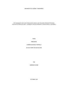 « Dynamiques de gouvernance dans les églises pentecôtistes transnationales de l'Afrique francophone à Montréal (Québec) » Thèse.