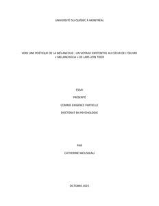 Mousseau, Catherine (2025). « Vers une poétique de la mélancolie : un voyage existentiel au coeur de l'oeuvre « Melancholia » de Lars Von Trier » Thèse. Montréal (Québec), Université du Québec à Montréal, Doctorat en psychologie (Essai doctoral).