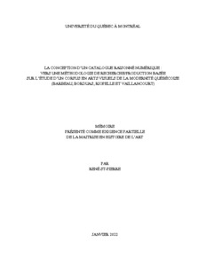 Le catalogue raisonné est devenu un outil essentiel pour le marché et la recherche en histoire de l’art depuis la fin du XVIIIe siècle. En préservant la trace documentaire la plus large et la plus complète possible du travail d'un artiste et du contexte historique dans lequel son œuvre fut produit, le catalogue raisonné fait figure d’autorité dans le domaine, une autorité pouvant se monnayer et aussi faire l’objet de litiges ou de contestations. S’intéressant d’abord à l’émergence de cette forme littéraire apparue au milieu du XVIIIe siècle, cette recherche s’attarde ensuite aux variations contemporaines que le catalogue raisonné peut présenter dans l’environnement numérique, en étudiant, entre autres, le processus ayant présidé à la conception des catalogues raisonnés de quatre figures marquantes de la modernité québécoise, soit le sculpteur Armand Vaillancourt et les peintres Paul-Émile Borduas (1905-1960), Jean Paul Riopelle (1923-2002) et Marcel Barbeau (1925-2016). Enfin, par la présentation de pratiques exemplaires et de recommandations, ce mémoire veut sensibiliser toute personne intéressée par la conception de ce type d’objet de connaissance dans le contexte des humanités numériques et des potentialités offertes par les technologies de l’information, les réseaux sociaux et le Web des données liées (Web sémantique). Le public intéressé est large : artistes et leur succession, galeristes et marchands d’art, commissaires d’exposition et conservateurs de musées, étudiants en arts, en histoire de l’art, en muséologie, en sciences de l’information et en archivistique. Ce mémoire est accompagné d’un site Web (http://archivart.ca/CAT-RAIS/) préservant la trace, sous forme de capsules vidéo, des entrevues réalisées à l’automne 2019 avec des acteurs et intervenants du monde de l’art qui utilisent, conçoivent ou encore qui ont produit des catalogues raisonnés numériques.