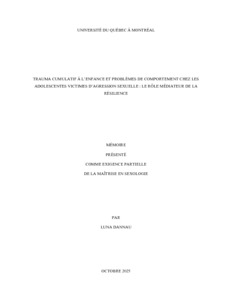 « Trauma cumulatif à l'enfance et problèmes de comportement chez les adolescentes victimes d'agression sexuelle : le rôle médiateur de la résilience » Mémoire.