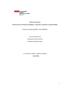 Cahier de recherche du groupe des Chercheur.e.s en Responsabilité Sociale et Développement Durable (CRSDD) consacré au thème de la gouvernance et les transitions écologiques : approches, paradoxes et responsabilités. Résumés critiques d'articles portant sur ce sujet. Cahier de recherche élaboré sous la supervision de Corinne Gendron et Stéphanie Yates.