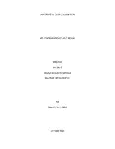 Le présent mémoire traite des fondements du statut moral. L'objectif est de déterminer quelles sont les conditions nécessaires et/ou suffisantes pour qu'une entité compte moralement. Les principales théories du fondement du statut moral sont exposées puis critiquement analysées. Elles sont classées en trois grandes catégories : (1) les approches intrinsèques, (2) les approches relationnelles et (3) les approches alternatives. Le premier chapitre est dédié aux approches intrinsèques (phénoménales, biocentristes et logocentristes), qui fondent le statut moral sur la possession de certaines propriétés intrinsèques (conscience/sentience, la vie ou certaines capacités cognitives, respectivement). Le deuxième chapitre se concentre sur les approches relationnelles (l’appartenance à l’espèce Homo Sapiens, l’écocentrisme et la participation au contrat social) qui fondent le statut moral sur l’engagement dans certaines relations (d’espèce, avec son écosystème ou par l’engagement dans des relations réciproques, respectivement). Le troisième et dernier chapitre porte sur les approches dites « alternatives » (potentialité, capacités réalisées de manière incomplète et existence future). Celles-ci ne sont pas classables dans les deux premières catégories car elles ne fondent pas le statut moral sur la possession actuelle d’une propriété, intrinsèque ou relationnelle, mais plutôt sur des formes « alternatives » que peuvent prendre ces propriétés (propriétés que l’entité a le potentiel de développer, que l’entité possède de manière incomplète, ou qu’elle possèdera lors d’une existence éventuelle). Parmi les propriétés avancées par les approches intrinsèques, la sentience sera reconnue comme suffisante pour fonder le statut moral, mais pas nécessaire. Le fait d’être vivant sera rejeté : ce n’est ni nécessaire ni suffisant d’être vivant pour posséder un statut moral. La suffisance de certaines capacités cognitives (rationalité et agentivité) pour fonder le statut moral sera jugée plausible. Les approches relationnelles seront, quant à elles, toutes rejetées. Finalement, parmi les approches alternatives, seule la suffisance du potentiel pour fonder le statut moral sera jugé plausible.