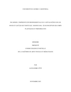 Coté, Alexandre (2025). « Incarner l'empreinte environnementale du capitalocène sur les rives et les îles de Tiohtià:ke / Mooniyang : écoconception de corps plastiques et performatifs » Mémoire. Montréal (Québec, Canada), Université du Québec à Montréal, Maîtrise en arts visuels et médiatiques.