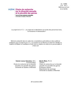 Galantino, Gabriel James et Blais, Martin (2021). Le projet de loi nº2 : un projet de loi attentatoire aux droits des personnes trans, non-binaires et intersexuées ?. Université du Québec à Montréal, Chaire de recherche sur la diversité sexuelle et la pluralité des genres.
