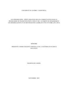 Jardel, Roxane (2025). « Les démobilisées : désécurisation des ex-combattantes dans le programme de transition post-conflit de l'Autorité de Désarmement, de Démobilisation et de Réintégration (ADDR) en Côte d'Ivoire (2012-2015) » Mémoire. Montréal (Québec), Université du Québec à Montréal, Maîtrise en science politique.