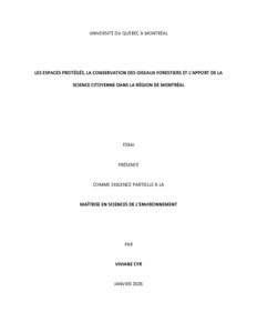 « Les espaces protégés, la conservation des oiseaux forestiers et l'apport de la science citoyenne dans la région de Montréal » Essai.