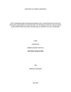 « Effet d'interventions pédagogiques basées sur l'utilisation par les élèves de pratiques langagières de justification et de reformulation sur l'évolution de leurs conceptions en science technologie au premier cycle du secondaire » Thèse.