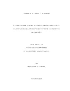 Les organisations humanitaires jouent un rôle crucial en menant des opérations telles que la distribution rapide et efficace de produits essentiels aux populations vulnérables touchées par une catastrophe naturelle. Les retards ou les échecs dans la livraison de ces produits peuvent avoir des conséquences graves sur la santé et le bien-être des personnes sinistrées. Cette thèse se concentre sur la conception de Réseaux de Chaîne d’Approvisionnement Humanitaire (RCAH) après une catastrophe naturelle, dans un contexte où les ressources sont limitées et où une grande incertitude concernant les conditions dans les zones affectées ainsi que la gravité de la crise complique la planification. Trois articles scientifiques sont présentés traitant des enjeux décisionnels importants pour cette planification. Dans le premier article, nous formulons et résolvons le problème de conception du RCAH en tenant compte de différentes sources d’incertitude. Plus précisément, nous proposons une méthodologie d’optimisation permettant de concevoir un RCAH destiné à stocker et distribuer des produits critiques à une population affectée sur un horizon temporel donné. Un modèle stochastique à deux étapes est développé pour traiter l’incertitude liée à la demande, ainsi qu’aux capacités de transport et de stockage au sein du réseau. Dans la première étape, des décisions de conception, telles que la sélection des hubs, des services, des stocks et des ressources de transport, sont prises, définissant ainsi la structure du RCAH pour toute la durée de l’horizon de planification. Dans la deuxième étape, des décisions opérationnelles liées au transport, au stockage et à l’allocation des produits sont prises. Le modèle intègre également les impacts cumulatifs de la demande non satisfaite en produits critiques au fil du temps. Le deuxième article traite de l’ambiguïté concernant les distributions probabilistes inhérentes au contexte de planification du problème de conception d’un RCAH. Après une catastrophe naturelle, les décideurs s’appuient sur des estimations de paramètres incertains issues de diverses sources de données (par exemple, enquêtes, images satellites, rapports gouvernementaux ou médias) pour planifier les efforts de secours humanitaires. Cependant, ces estimations peuvent entraîner des divergences significatives dans la manière dont les paramètres incertains sont formulés en tant que variables aléatoires, générant ainsi une ambiguïté dans le processus de planification. Cet article propose plusieurs approches d’optimisation permettant de résoudre ce problème en prenant explicitement en compte cette ambiguïté dans la conception du RCAH. Les deux premiers articles supposent que la structure du RCAH reste inchangée pendant l’horizon de planification, en raison de la complexité de la coordination avec d’autres opérations humanitaires en cours (par exemple, l’enlèvement des débris) et du coût élevé d’acquisition de nouvelles ressources. Cela dit, certains ajustements peuvent néanmoins être envisagés par les organisations humanitaires pour réajuster les plans établis et les rendre plus efficients lorsque de nouvelles informations deviennent disponibles. Par conséquent, dans le troisième article, nous proposons un modèle de conception d’un RCAH à plusieurs étapes permettant le transfert des ressources de transport (par exemple, les camions) entre les services sélectionnés au sein du RCAH conçu. De plus, le modèle autorise la sélection de services de transport supplémentaires à chaque étape de l’horizon de planification et repose sur une formulation du processus de divulgation d’informations qui reflète de manière plus réaliste ce qui est observé sur le terrain. Dans l’ensemble, cette thèse met en lumière l’importance de considérer divers facteurs dans le problème de conception du RCAH. Un accent particulier est mis sur la modélisation de la propagation de la demande non satisfaite, étant donné qu’un manque des commodités essentielles peut entraîner une propagation de maladies. Le premier article souligne le rôle crucial du facteur de propagation dans l’optimisation de l’efficacité du réseau. Le deuxième article met en avant la nécessité de prendre en compte l’ambiguïté dans le contexte informationnel lors de la planification des opérations humanitaires. Plus spécifiquement, les résultats obtenus suggèrent que des approches robustes de modélisation sont essentielles pour une prise de décision efficace. Enfin, le troisième article démontre la valeur d’un modèle à plusieurs étapes permettant d’adapter les ressources de transport au fil du temps, améliorant ainsi la flexibilité et la réactivité du RCAH. Ensemble, ces contributions renforcent la capacité à résoudre les problèmes de conception d’un RCAH, permettant de concevoir des réseaux plus résilients et adaptables suite à une catastrophe naturelle, réduisant ainsi les impacts attendus sur les populations vulnérables des régions affectées.