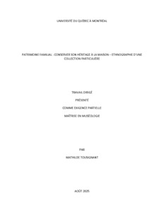 Tousignant, Mathilde (2025). « Patrimoine familial : conserver son héritage à la maison – ethnographie d’une collection particulière » Travail dirigé. Montréal (Québec, Canada), Université du Québec à Montréal, Maîtrise en muséologie.