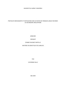 Dalle, Catherine (2025). « Pratiques enseignantes et motivation chez les élèves de français langue seconde au secondaire anglophone » Mémoire. Montréal (Québec), Université du Québec à Montréal, Maîtrise en didactique des langues.