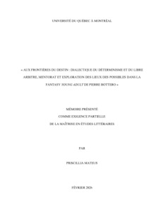Mateus, Priscillia (2026). « Aux frontières du destin : dialectique du déterminisme et du libre arbitre, mentorat et exploration des lieux des possibles dans la fantasy young adult de Pierre Bottero » Mémoire. Montréal (Québec, Canada), Université du Québec à Montréal, Maîtrise en études littéraires.
