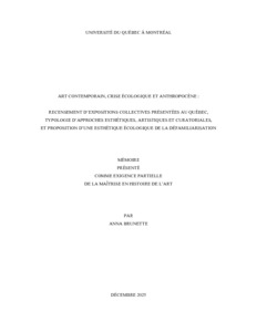 « Art contemporain, crise écologique et Anthropocène : recensement d'expositions collectives présentées au Québec, typologie d'approches esthétiques, artistiques et curatoriales, et proposition d'une esthétique écologique de la défamiliarisation » Mémoire.